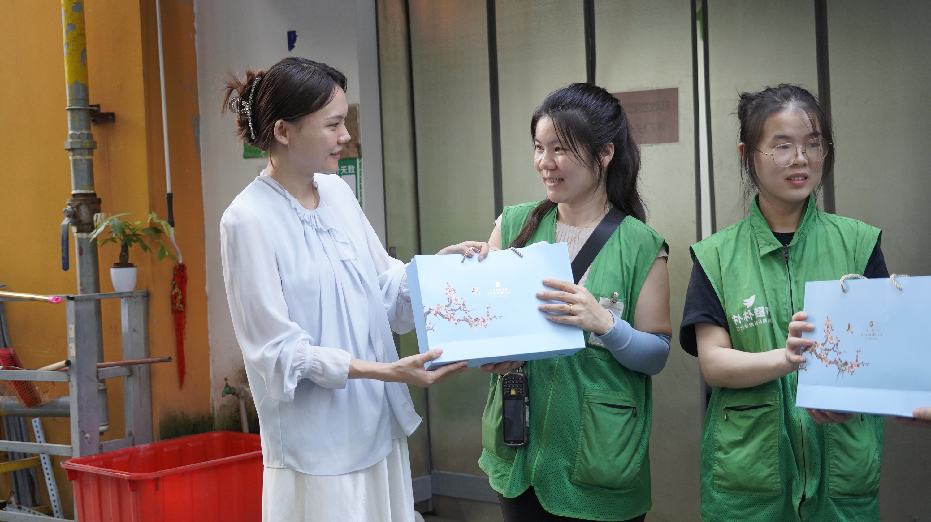海珠区妇联党组书记、主席、一级调研员蒋薇与广爱社工们一同化身“暖心速递员”,带着满载祝福的爱心慰问品,于9月30日下午不间断地前往朴朴超市青年复式公寓店、朴朴超市万胜围店等站点。在站点内,蒋主席亲手将包装精致的爱心月饼递到每一位女骑手手中,与她们亲切握手,送上节日的诚挚问候:“中秋佳节快到了,感谢你们风里来雨里去,为大家的生活便利奔波,这份爱心慰问品代表着我们的心意,祝你们和家人中秋快乐、平安顺遂!”一句句暖心话语,让女骑手们在忙碌的工作间隙感受到了“娘家人”般的温暖。