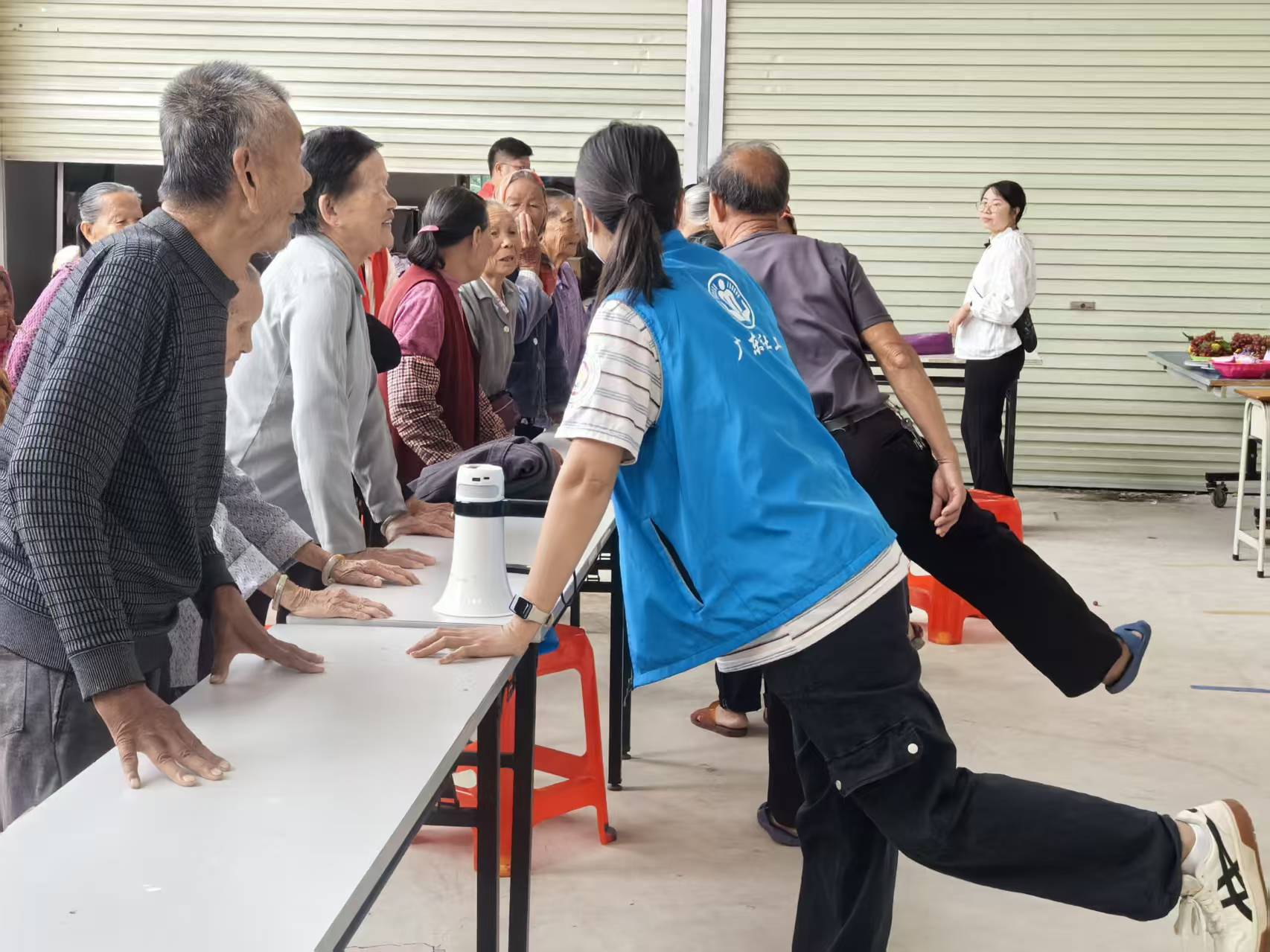图为社工志愿者引导长者们进行平衡力锻炼操实操演示