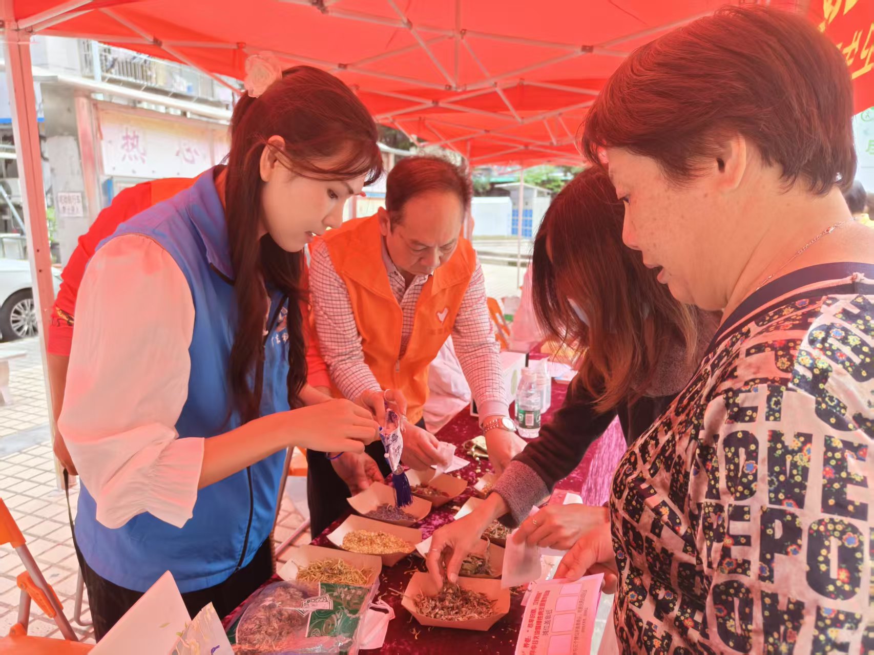 10月29日,广州市“红棉惠爱”社工民生建设志愿服务队、金花街“双百工程”社工服务站携手金花街道计划生育协会、金花街道公共卫生委员会、北京同仁堂康王店、广大口腔志愿服务队、广州市正佳慈善基金会、好易康生物科技(广州)有限公司多家爱心单位,共同举办“岁岁重阳,中医护康”重阳节中医健康关怀行动。现场设置别具特色的中医健康手工体验区,长者们在社工志愿者的指导下制作竹编香囊、手工卷艾条、艾草薄荷膏,在动手过程中学习中医药知识。室外便民市集则提供中医问诊、口腔检查、政策宣传、义剪、义卖等服务。并且特别关注高龄及行动不便长者,开展上门探访,送上实用物资与暖心关怀。