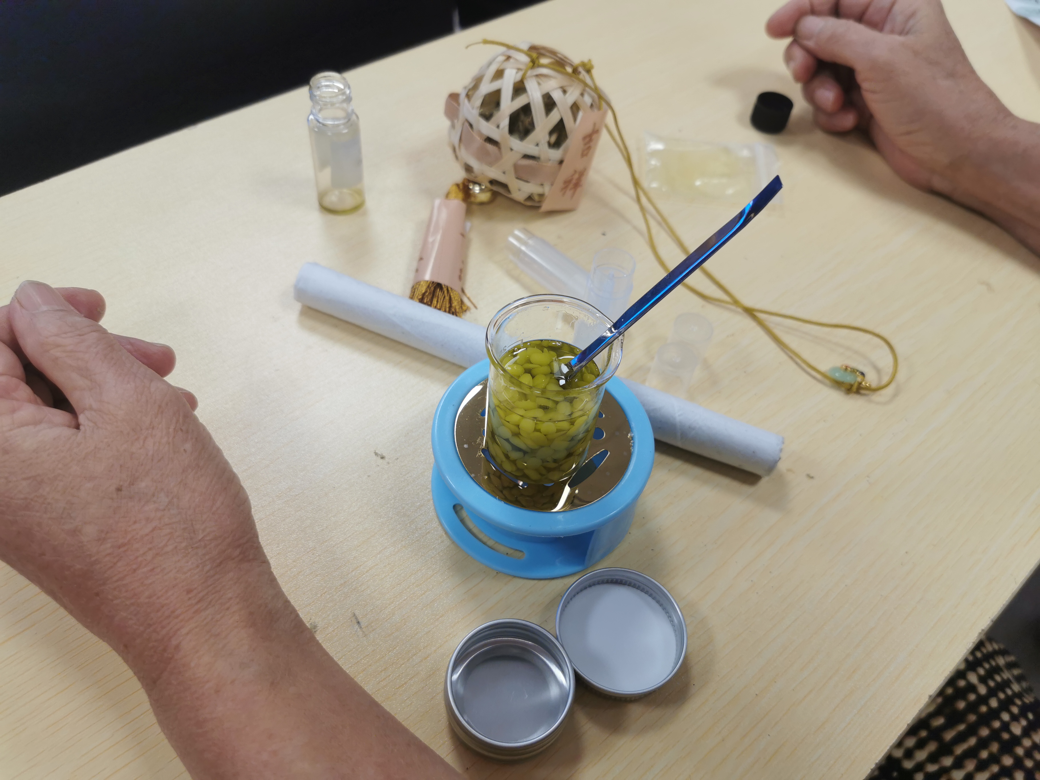 图为长者们在社工志愿者的指导下制作竹编香囊、手工卷