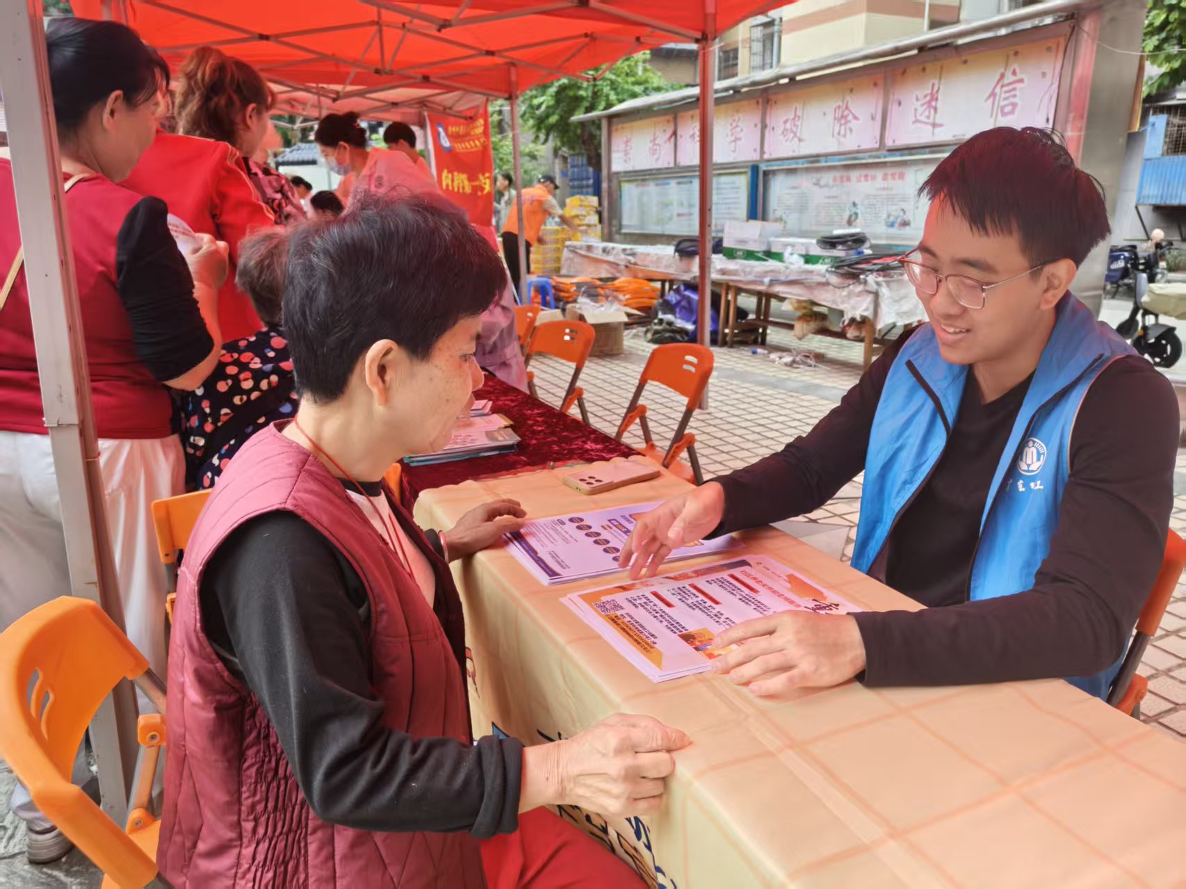 图为社工志愿者耐心讲解医疗救助政策