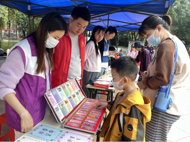 除了专业讲解,广爱禁毒社工和禁毒专干还结合自创禁毒特色项目——《禁毒火眼金睛》小篆识毒游戏卡牌,向在场居民普及禁毒知识,寓教于乐,丰富禁毒宣传形式,提高禁毒知识普及率。居民们积极参与互动,在趣味游戏中加深对毒品种类、特征的记忆,主动学习禁毒知识的热情十足。现场还派发了 100 余份禁毒宣传手册,方便居民随时查阅,工作人员耐心解答各类疑问,手把手传授识别伪装毒品、应对涉毒诱惑的实用技巧。