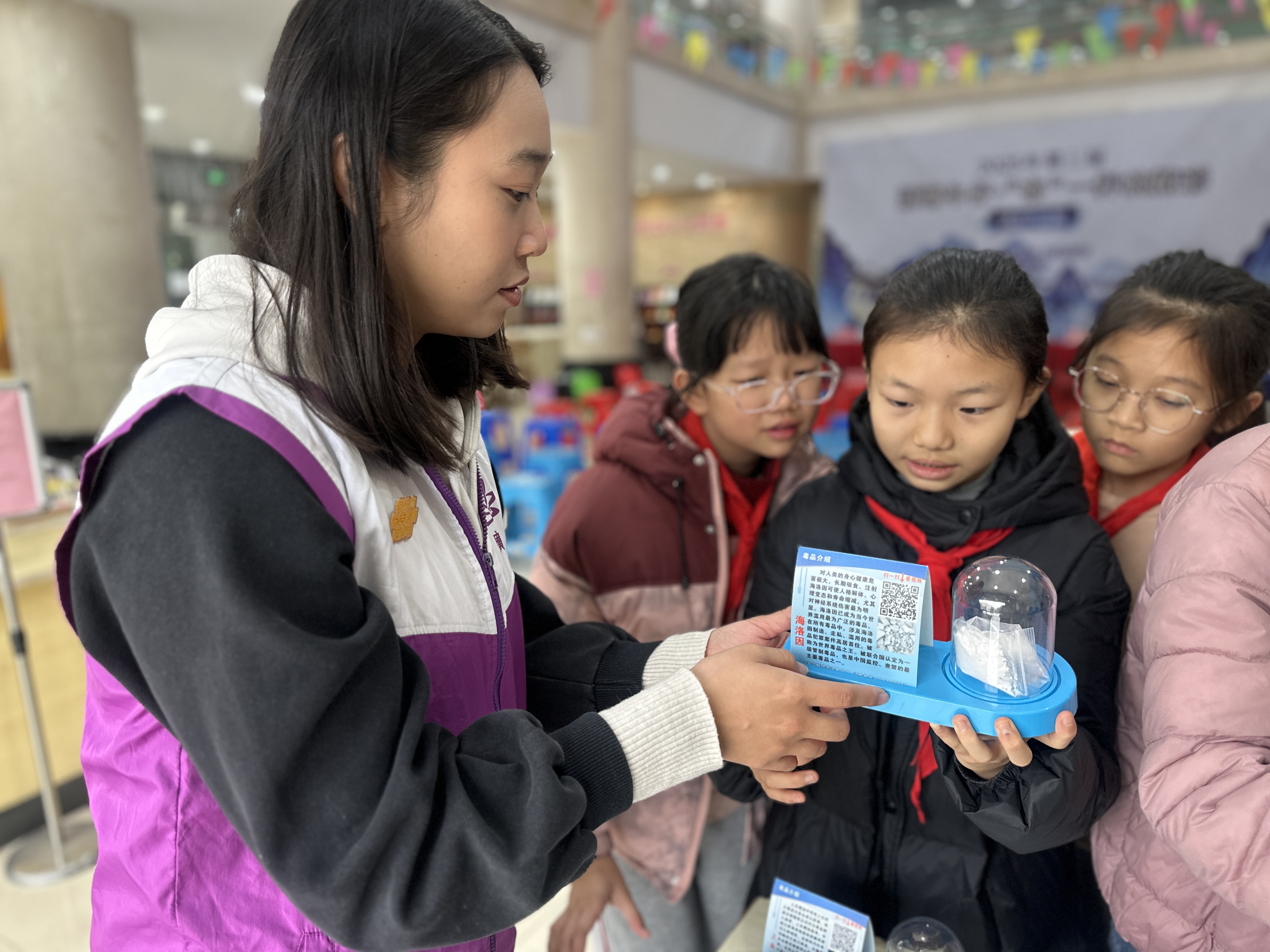 社工们结合仿真模型,用通俗易懂的语言向学生们讲解毒品相关知识,重点聚焦伪装性极强的新型毒品:针对外观酷似糖果的“摇头丸”、迷惑性较高的“Y仔”、外形精美可爱的“邮票”以及极具隐蔽性的“上头电子烟”等新型毒品,详细介绍其外形特征、成瘾原理和严重危害,提醒学生们切勿因好奇心捡拾、食用陌生零食或物品。