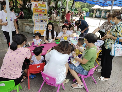 在公益宣传区,街道相关部门为居民宣传扫黑除恶、禁毒知识,提升社区的安全稳定;广州市百世传承法律咨询服务有限公司的工作人员为居民普及法律知识,解答居民在遗嘱继承等方面的困惑;广州大卫教育科技有限公司的专业老师现场教小朋友做手工,锻炼小朋友的动手能力,促进社区儿童互动,同时义卖体验课程,将收益捐赠给沙园街社区基金用于长者扶手改造。