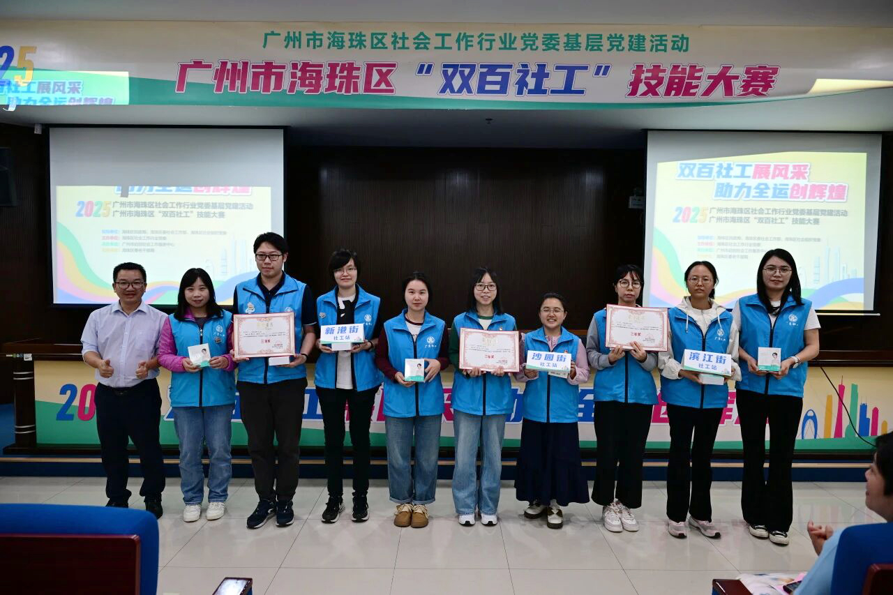 大赛设置社工专业知识笔试、专业知识问答、实务项目路演三个环节,全面检验“双百工程”社工的专业素养与实务能力。由广州市广爱社会工作服务中心承接运营的沙园街“双百工程”社工服务站参赛队伍凭借扎实的专业基础、出色的实务能力和默契的团队协作,荣获大赛三等奖。同时,龙凤街“双百工程”社工服务站参赛队伍也在激烈角逐中表现出色,获得优秀奖。
