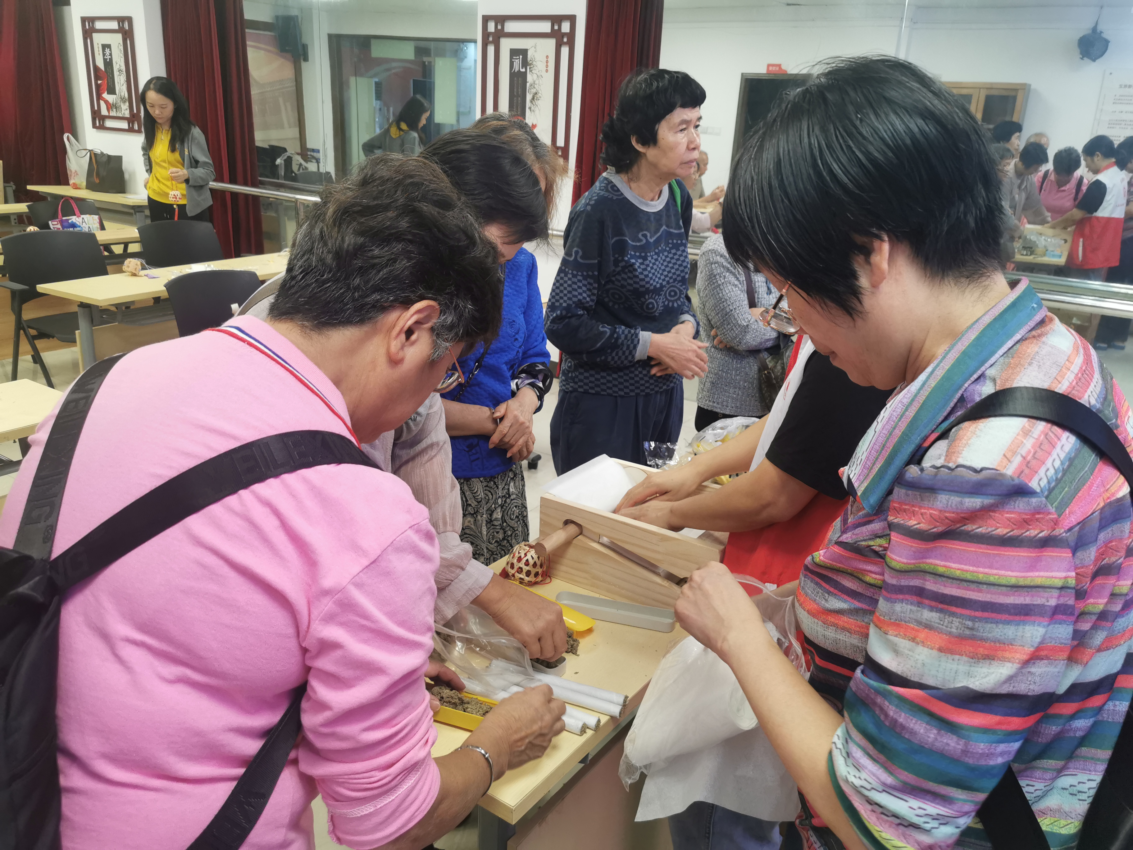 图为长者们在社工志愿者的指导下制作竹编香囊、手工卷
