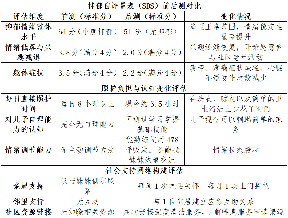 认知与行为层面,邓姨的非理性认知彻底转变,从“事事代劳”转变为 “引导赋能”,现今邓姨儿子掌握2项基础生活技能,照护负担切实减轻;